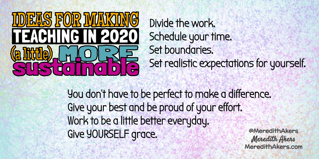 I happened to come across a blog post Matt Miller shared way back in 2014 today that totally applies to our current situation as educators in 2020. Basically, Matt says you can’t do it all. You have to pick priorities and set boundaries so you can still enjoy your family, live your faith, and take care of yourself. This is harder than EVER in our current situation in 2020 in hybrid classrooms – where teachers are teaching BOTH face-to-face students and online learners simultaneously. I’ve heard a lot of educators saying that what we are currently doing is not sustainable. They are right! We can’t continue to tip the scales of our lives toward work day after day and not even that out by tipping the other way toward family, faith, and self-care.