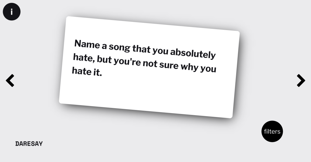 You may be thinking, “I don’t have time to come up a hundred get-to-know you questions.” Me either! But with checkin.daresay.io, you don’t have to! This nice little website (works like an app from your phone, too) gives you random prompts to pose to your students (or spouse, or children, or best friend) to get to know them a little better. There are even filters if you are looking for specific types of prompts. No-prep time and putting relationships first? Done and done!