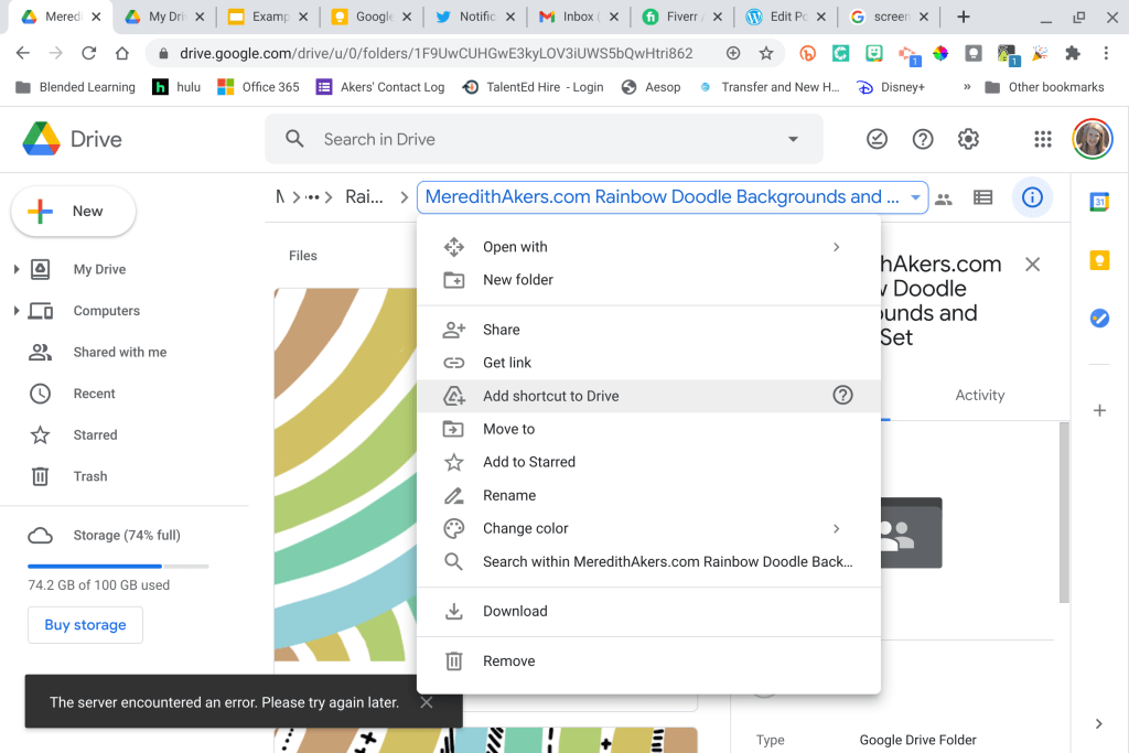 Two-finger click or Right click on the folder name “MeredithAkers.com Rainbow Doodle Backgrounds and Frames” then select “Add Shortcut to Drive” so that you have access in your personal Google Drive account. This will add a shortcut to the folder that contains all of these images in your “My Drive” – you can move this shortcut into any folder you want to get organized and it will still be searchable so that you can find and insert the images into your creations.